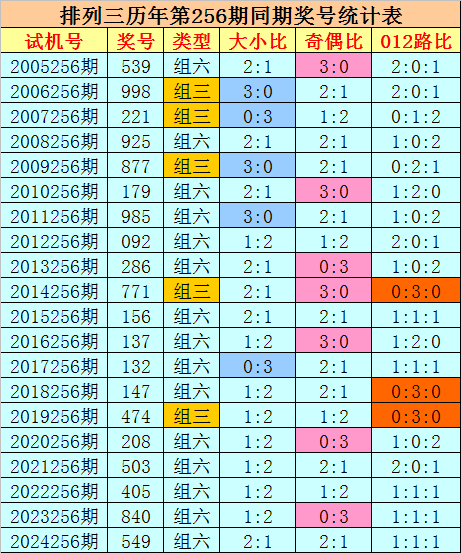 组选类型推荐:历史上排列三第256期同期奖号中,组六出现15期,组三出现5次,今年第256期预计奖号为组六号码。